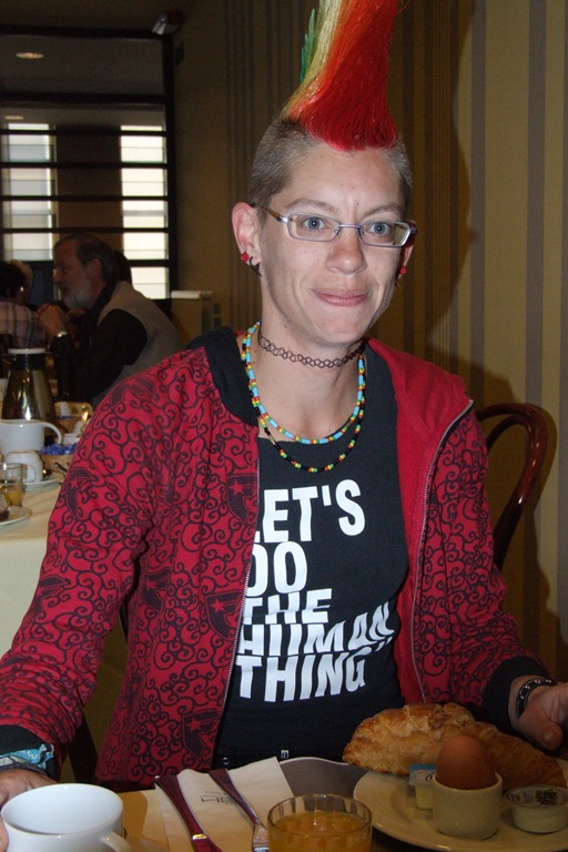 I am writing without notes at 10.18 on Monday 23 May. I was in good form this morning although I flooded the floor of the bathroom when I was having my shower. I must have made some kind of error with the shower concentrating as I was on opening and using both a sachet of body gel and a sachet of shampoo. Anyway I mopped it up fairly well. I washed and flossed my teeth and brushed my dentures last night. Trimmed around my upper lip with the Remington beard trimmer which I brought with me from Ireland. I put on clean underwear, a white Ralph Lauren semi-polo long-sleeved shirt, my silver Robbie slacks, fawn cotton non-elasticised socks, chocolate Loake brogues, glasses. Felt ship-shape and optimistic. Brought my Fuji FinePix 9500 S down to breakfast with malice aforethought. Drank coffee; masticated 2 beautiful croissants; consumed 4 slices of salami and a generous helping of pitted green olives: the same menu for breakfast as the one I concocted yesterday. Brought systematically all the diners I knew to their feet, snapped them in pairs mostly – under the roof window at the top of the dining room where a lot of the food for breakfast was laid out. Collected the autograph of every individual I photographed. Some of them were truly organised and gave me their cards as well. Anyway I was in great humour and enjoyed the crack. I continued to take photographs during the day but more informally without lining people up. Fortunately the room where ENUSP were working all day had glass down one side and enough soft light to work the camera fine on a natural light setting. The rectangular open space outside was shady with an umbrella and soft light which was very suitable for photography. The energy of the day dipped seriously in my opinion and the mood darkened when Mary Van Dievel came into the room before lunch proposing, almost as a fait accompli, an alliance between MHE and ENUSP and a sort of fairly formal coalition between that alliance and some members of the European Parliament in some kind of “interest” group. I was sitting opposite her and felt there was legerdemain going on so I cut fairly harshly into her almost immediately. However I did not pursue my line to the bitter end. Neither did I apologise. Elizabeth Winder decried the argumentative tone and Mary petered out pleading her voice was getting weak. My voice was strong but I did not want to continue the argument. Later during lunch Eric approached me. He is a senior man and he has reservations, too, I think. I suggested to him that it might be a good idea to slow things down. Actually I like Mary Van Dievel. I think she is a pro and I am not afraid of her. But I am not going to tell her that. The lunch in the deep pink walled restaurant MHE has been using for us with a beautiful mahogany female nude statue was a slow-motion affair. Starter, chicken and small potatoes casseroled in a plastic bag, chocolaty desert, glass of white wine. “Mary Van Dievel is not all bad,” I remarked to Eric during our short discussion, “She is paying for that,” I said pointing to the half full glass of white wine in front of me. Stefan stuck to me at lunch and later back at the hotel telling me very witty soviet jokes. I was grateful. He is a supportive person and he boosted my spirits which were low after the encounter with Mary Van Dievel. Anyway the air seemed to have leaked out of the ENUSP balloon and the energy of the morning evaporated. Then a strange thing happened. Berthold Koësel who was a little tense and keyed up beforehand ran a workshop under an umbrella in the quadrangle outside. Him; me; another Stefan, chairperson of Uilenspiegel. A Lithuanian woman who was there at the start deserted after 20 minutes or so dissatisfied with the lack of detail in Berthold’s proposal. “Peers in Progress.” I suggested contacts in Thessaloniki, Bavaria (where Berthold’s 76 year old father was a pedagogy professor), Maynooth. Get mental health services out of a medical context and into the area of education and personal development. Mentors: assistants. 2 ½ days x 12 training over 12 months. Anyway I found the workshop very stimulating, requested the honour of reporting back to the assembly in the room. Although none of the markers worked totally satisfactorily on the flip chart I enjoyed making a presentation and explaining the scheme. “You have very good teaching skills!” Debra remarked to me in the pancake house where Raphael brought us to celebrate the 20thbirthday of ENUSP. “I was a teacher,” I replied rather tersely to Debra. But I was grateful for her remark. I had finished my presentation with a reference to John Carty RIP. I ate crepes de patron, a pancake filled with a mess of prawns and creamy sauce. Drank a glass of white wine as well as a little sweet cider. Good chat with Jan Verhaegh who was sitting beside me. Biology and mental illness. But my stomach was acid and when Mats was giving his historical talk I was restless and worried wanting to get back to bed in the hotel in preparation for an early start in the morning. I put on my black Calvin Klein golf pullover outside but took it off again. It was still warm and it had been a warm sultry day. I took a chance and left with the eastern European man who has very little English, wears glasses, nice stature, serious mien, smokes. I trusted he knew the way; I certainly didn’t. Elizabeth Winder joined us in cheerful mood. We made our way hesitantly to Hotel Astrid without going astray. Elizabeth, who has time to sleep in the morning, went off for a walk on her own. I did not pack. Donned my short black and white pyjamas. Brushed and flossed my 5 ½ remaining teeth. Got in to bed 11.10 and slept till 02.00.